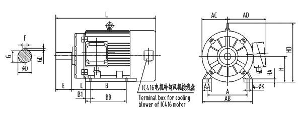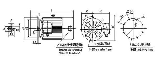 从轴伸端视之,电机接线盒位于机座右侧(355及以上机座号为机座上方)。用户如有特殊要求,请订货时说明,另行商议